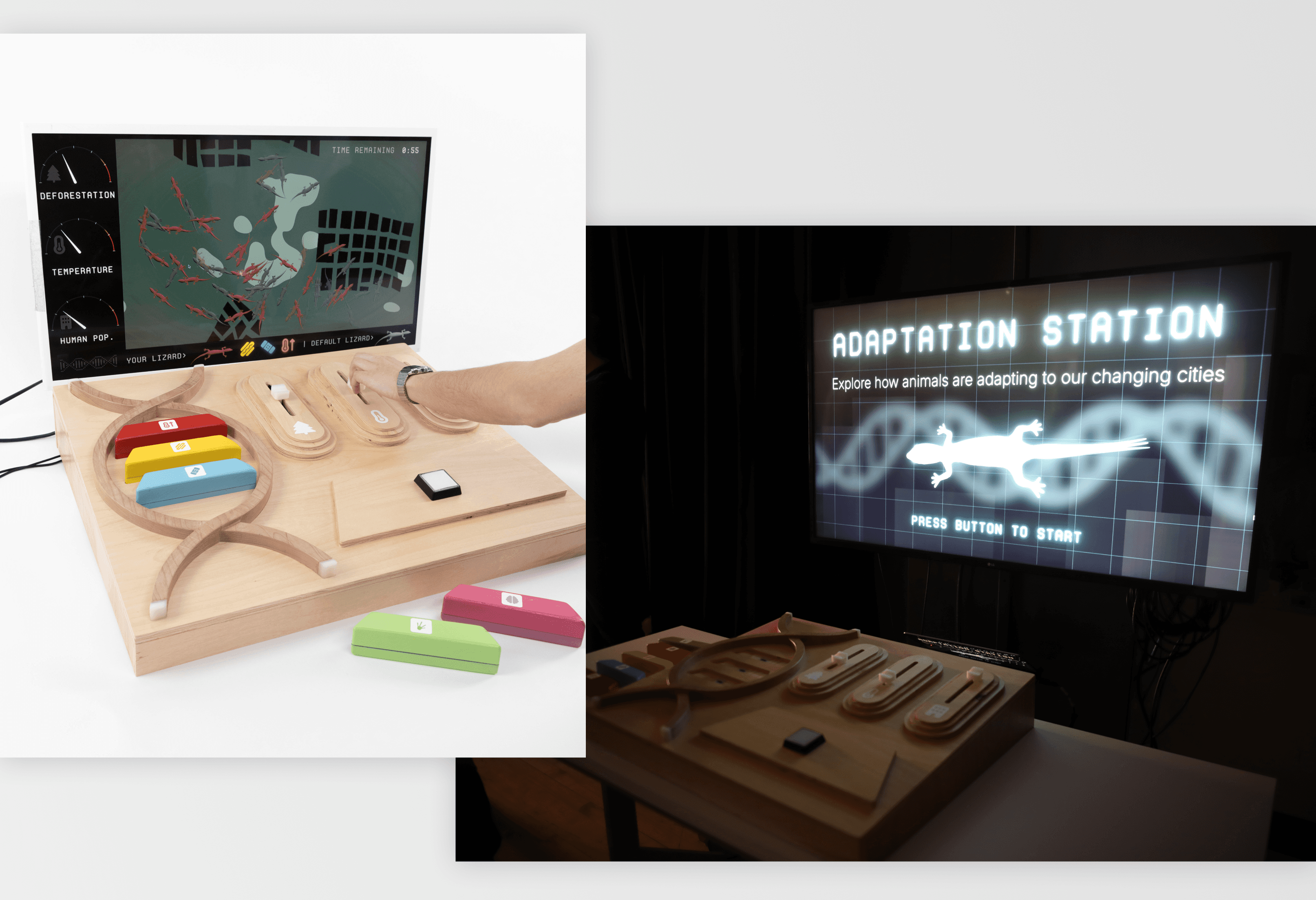 In the class Playful Communication of Serious Research with Brett Peterson, student groups pair with an NYU researcher to create a “museum exhibit” that makes their complex research fun, clear, and educational to the public. My team collaborated with Dr. Kristin Winchell, who studies how animals adapt to urban environments. Julia and I designed and developed a multi-stage Unity simulation where users explore how different genetic traits affect population outcomes. Led by Noah, we also built a wooden control panel with gene blocks and sliders that interface directly with the simulation using Arduino and serial communication.