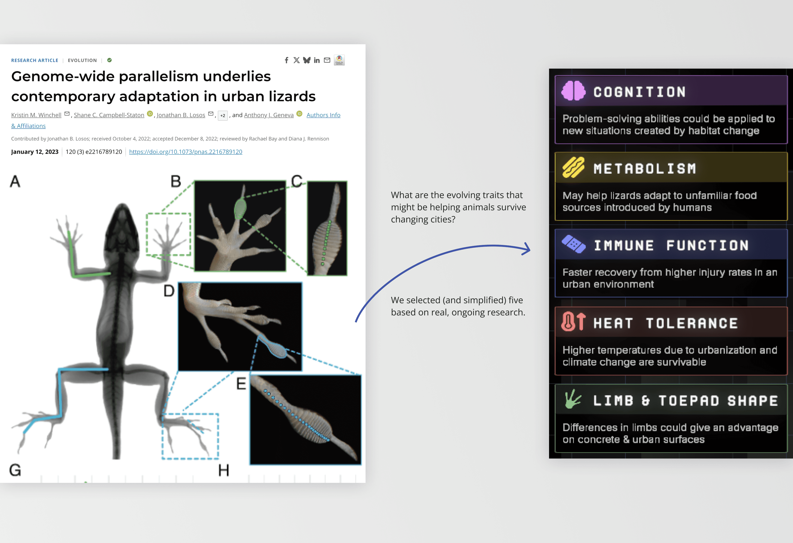 We interviewed Dr. Winchell and identified three key messages to convey through the experience: 1.) Cities create unique challenges (like concrete cover and higher temperatures), but animals are evolving to meet them faster than expected. 2.) Certain genes under study may correlate with greater success in urban environments (e.g. differently shaped limbs, better heat tolerance). 3.) Despite adaptation, environmental change can still push conditions beyond tolerable limits - research like Dr. Winchell's is needed to understand how we can design our built environments more responsibly.
