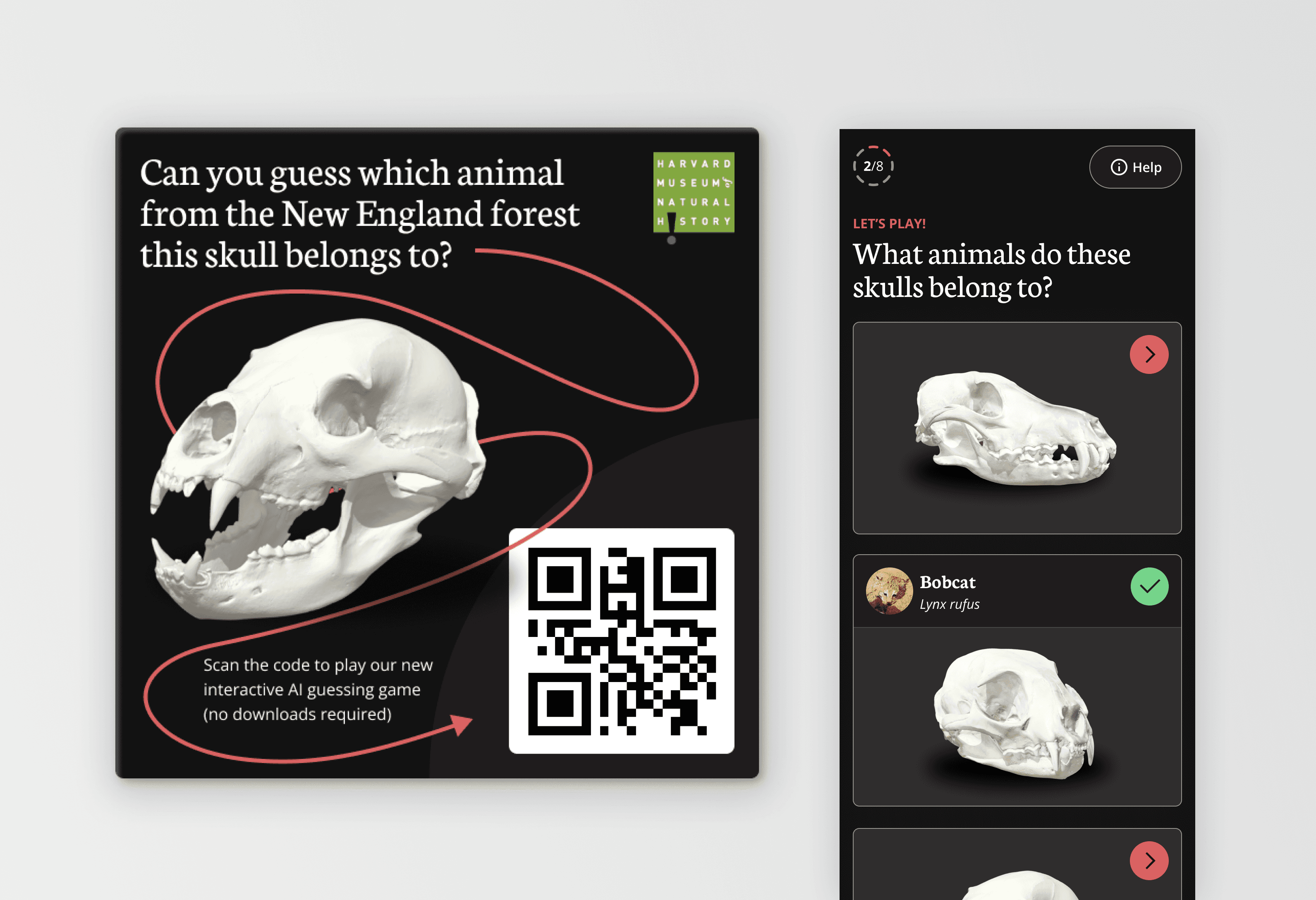 I wanted to explore how technology could promote learning when volunteers aren’t available. It was important to me that this concept encourages visitors to engage with the gallery, not just a screen. Using AR, participants must physically explore the space, locate an animal, and “scan” it to make their guess. In response to tester feedback, I added a feature to "place" the skulls in the surrounding environment for a better idea of scale.