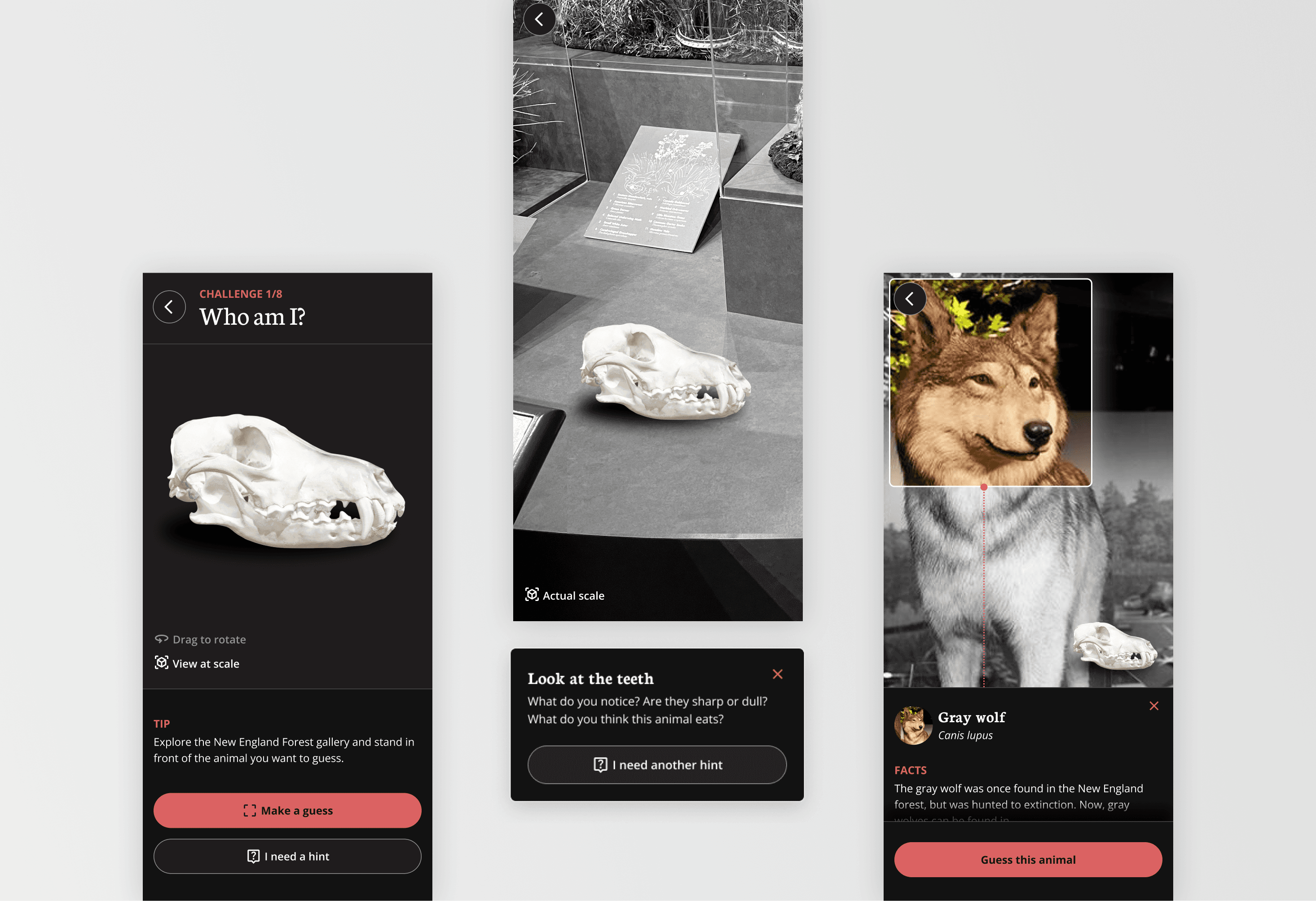 I prototyped this educational game concept for the New England Forests exhibit at the Harvard Museum of Natural History, where I volunteer as a gallery educator. One of the activities I run involves showing visitors different skulls and asking them to guess which animals they belong to. This teaches morphology and encourages them to look more closely at the exhibit. Notes: Content is based on curriculum by Wendy Derjue-Holzer at HMNH, and the 3D skulls used in my designs are courtesy of the RISD Nature Lab. This work is not officially affiliated with HMNH, it's just a personal project.