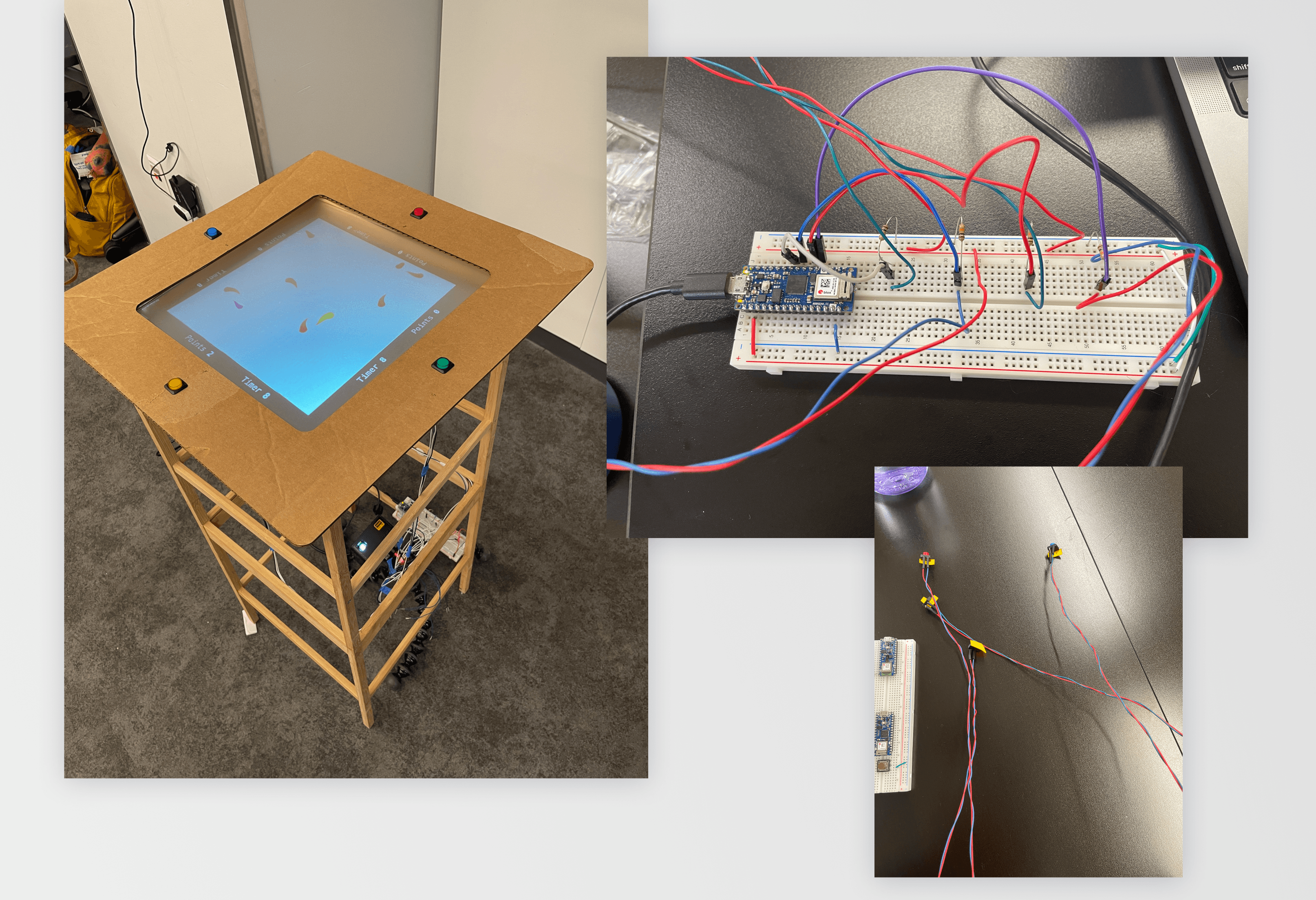 To test the game, we built scrappy prototypes. For the first session, I soldered buttons attached to long wires, and for the second, I laser-cut a cardboard prototype. These quick builds allowed us to iterate and gather valuable feedback as we refined the gameplay.